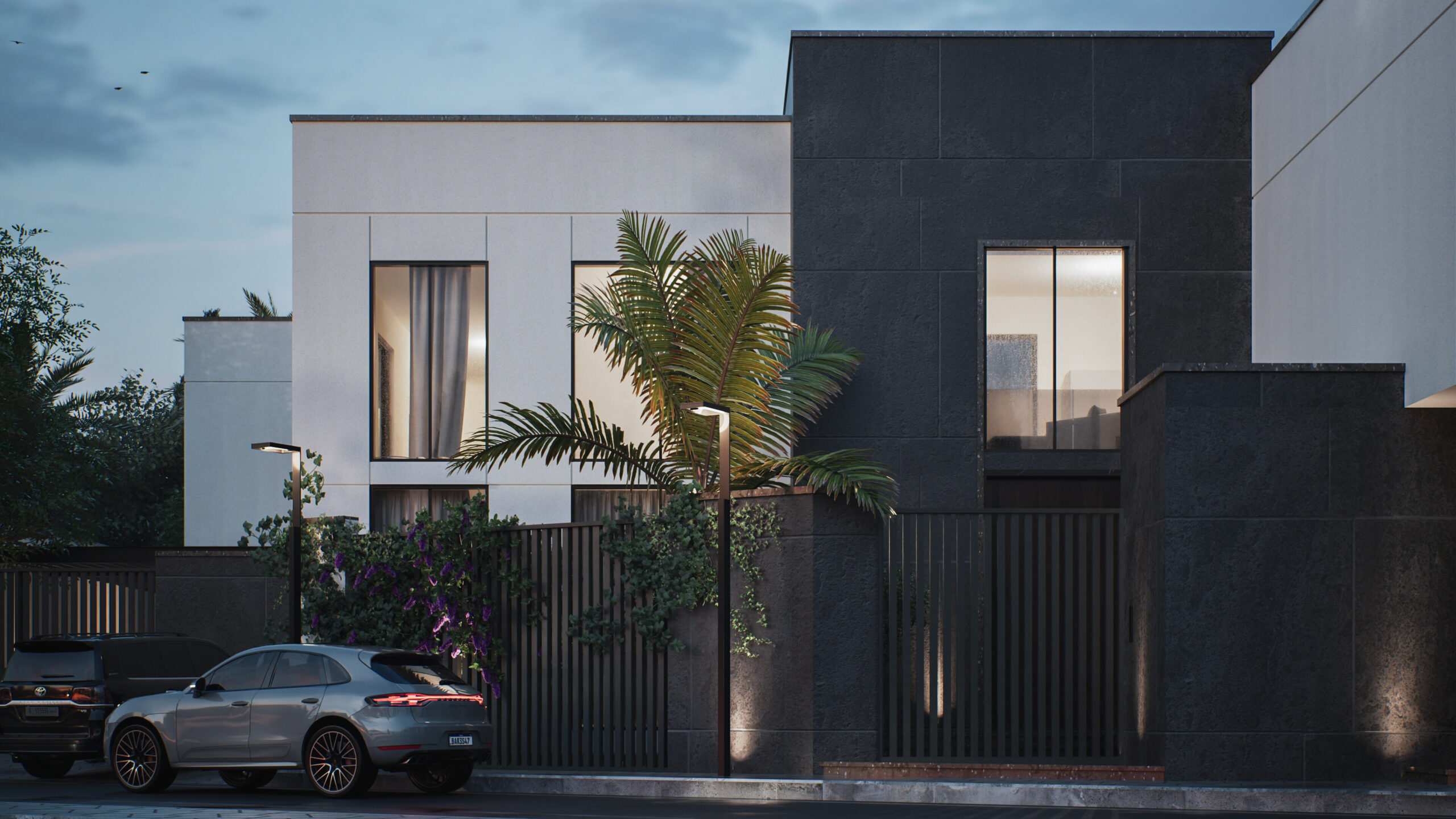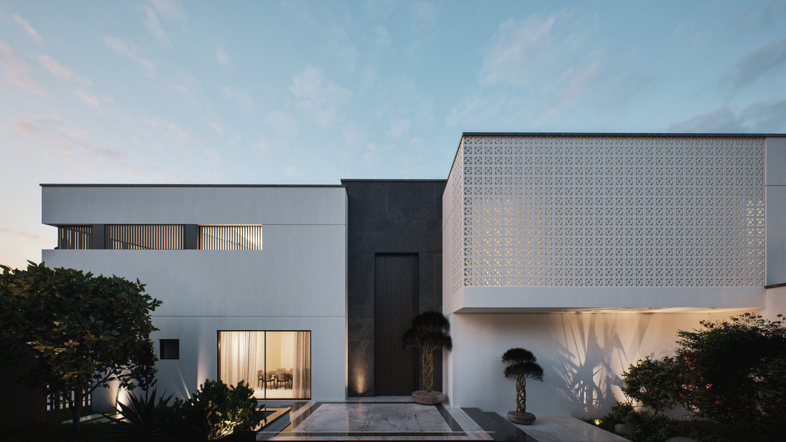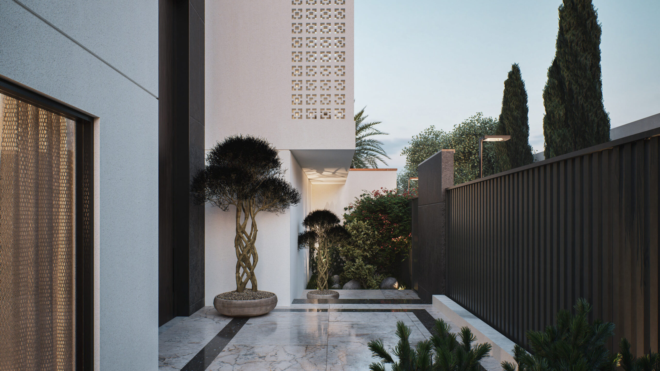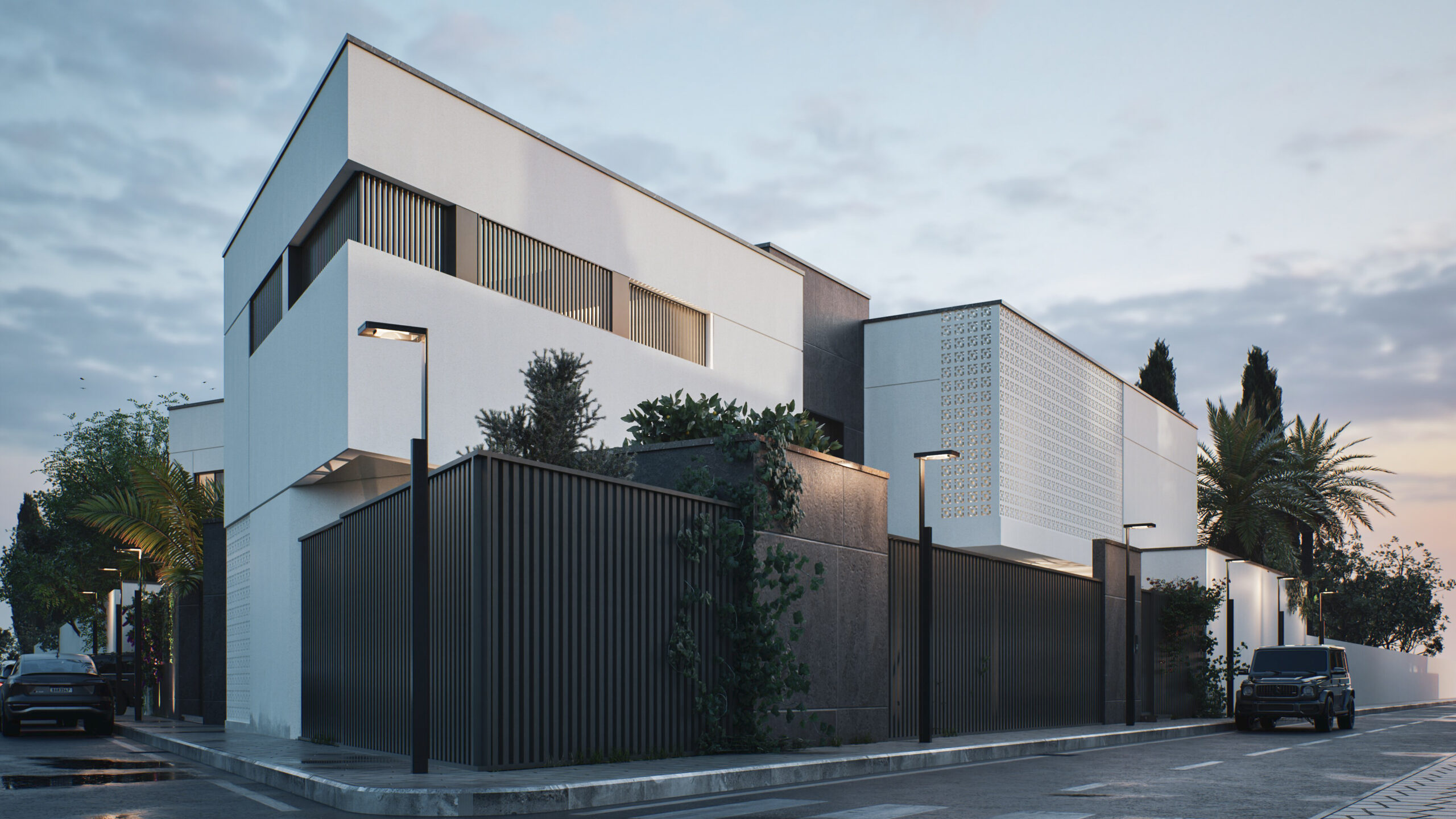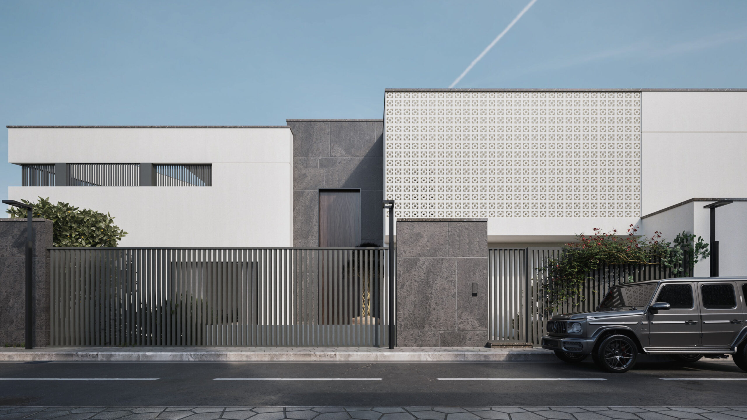 Set on a corner plot with two street frontages, Dar Al-Sarāb reads as a quiet monolith to the city and a