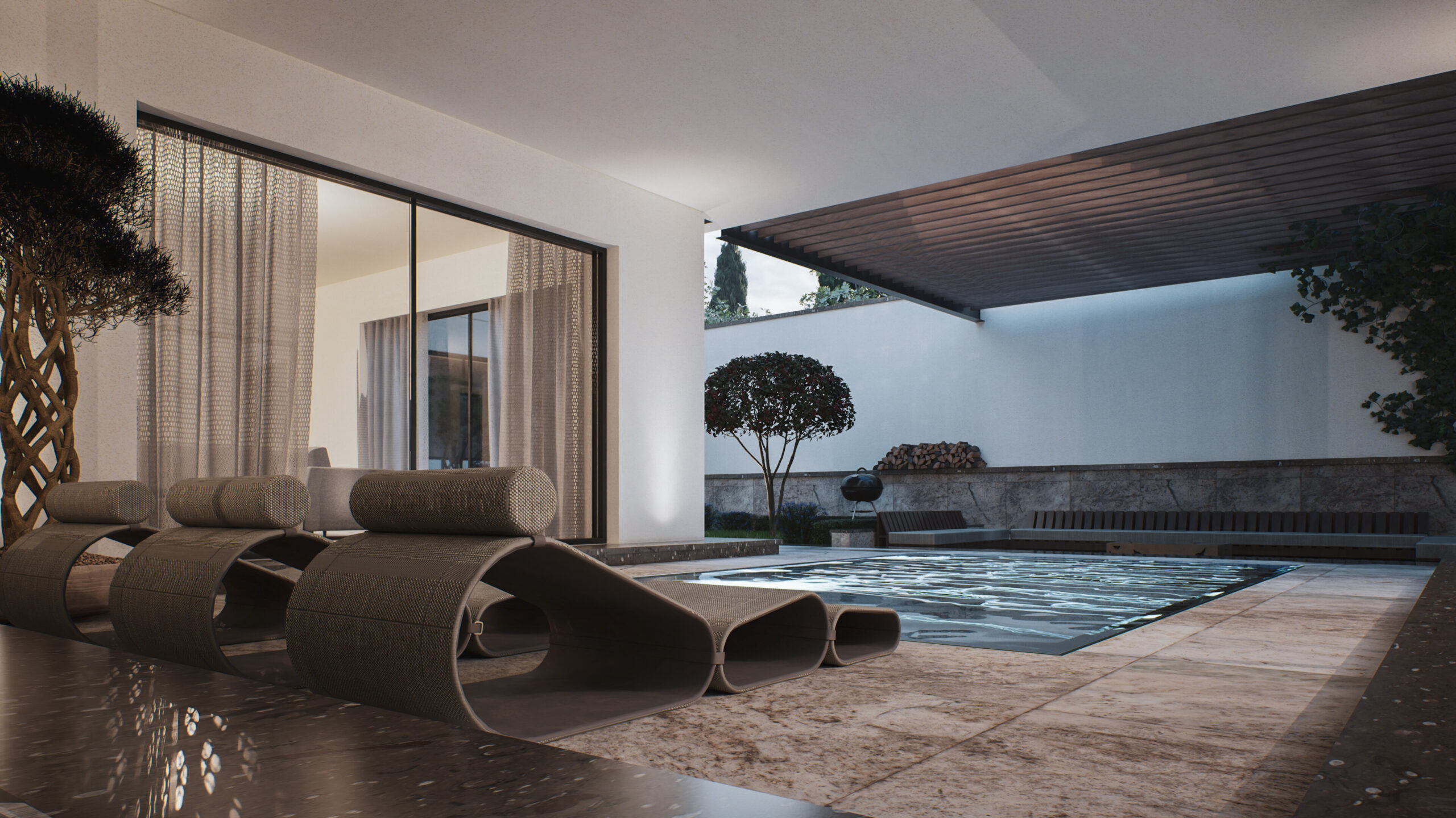 porous sanctuary within. Interlocking white volumes are anchored by charcoal-stone spines that frame the