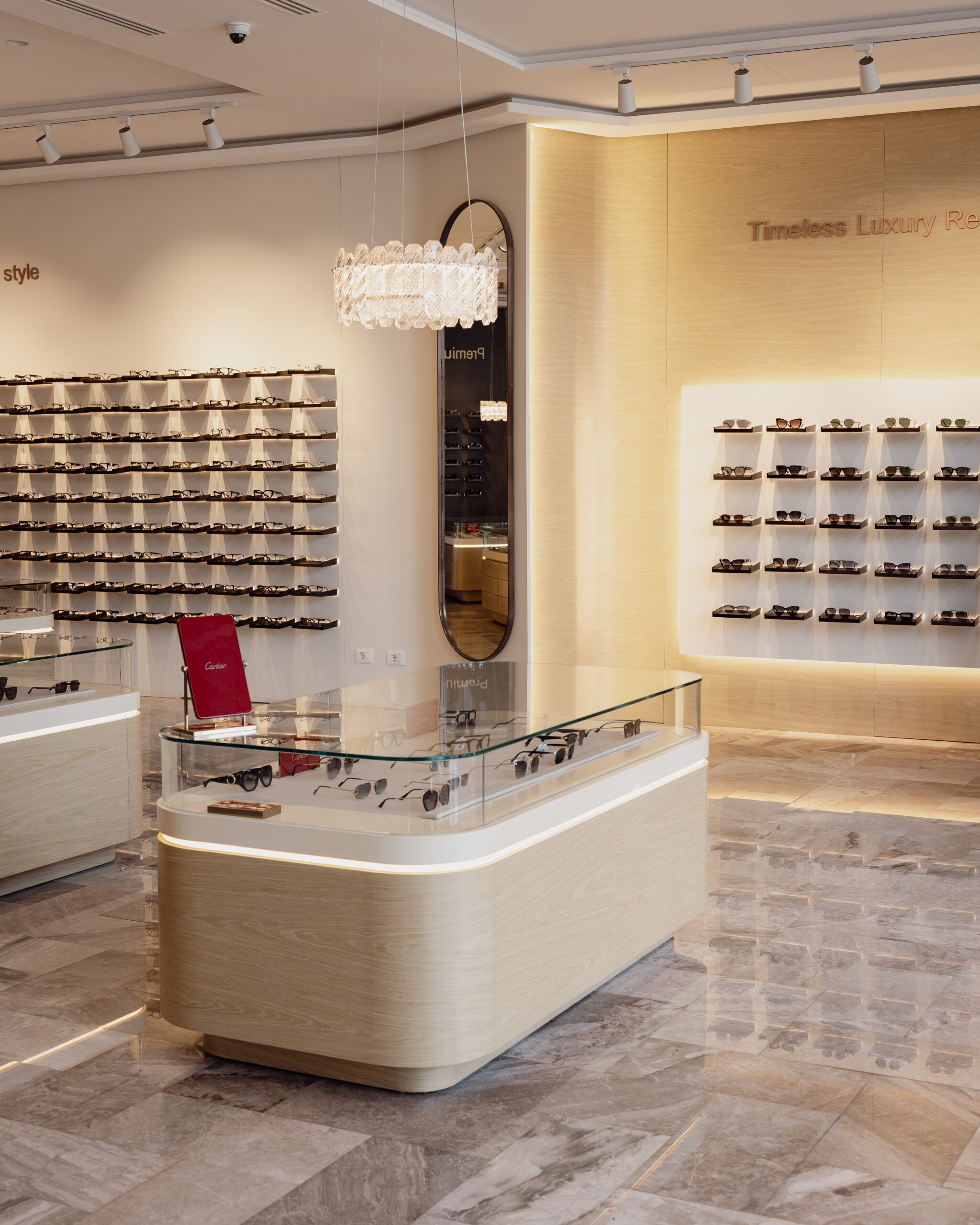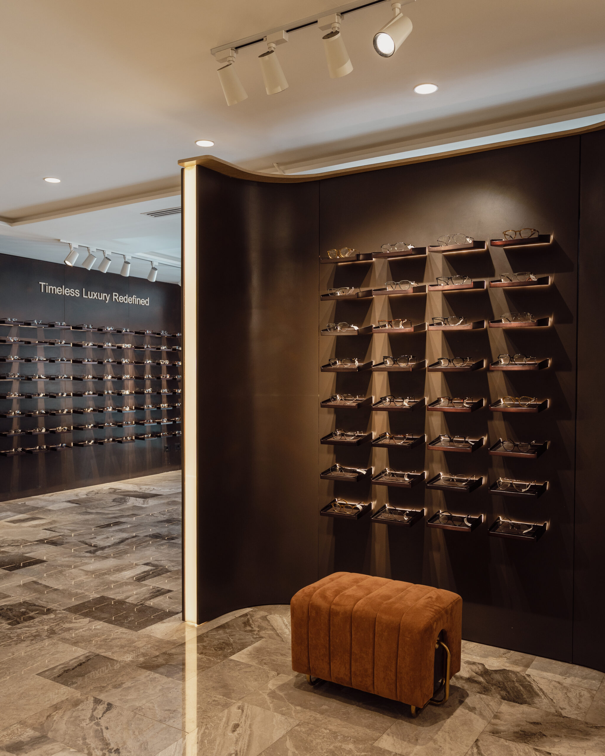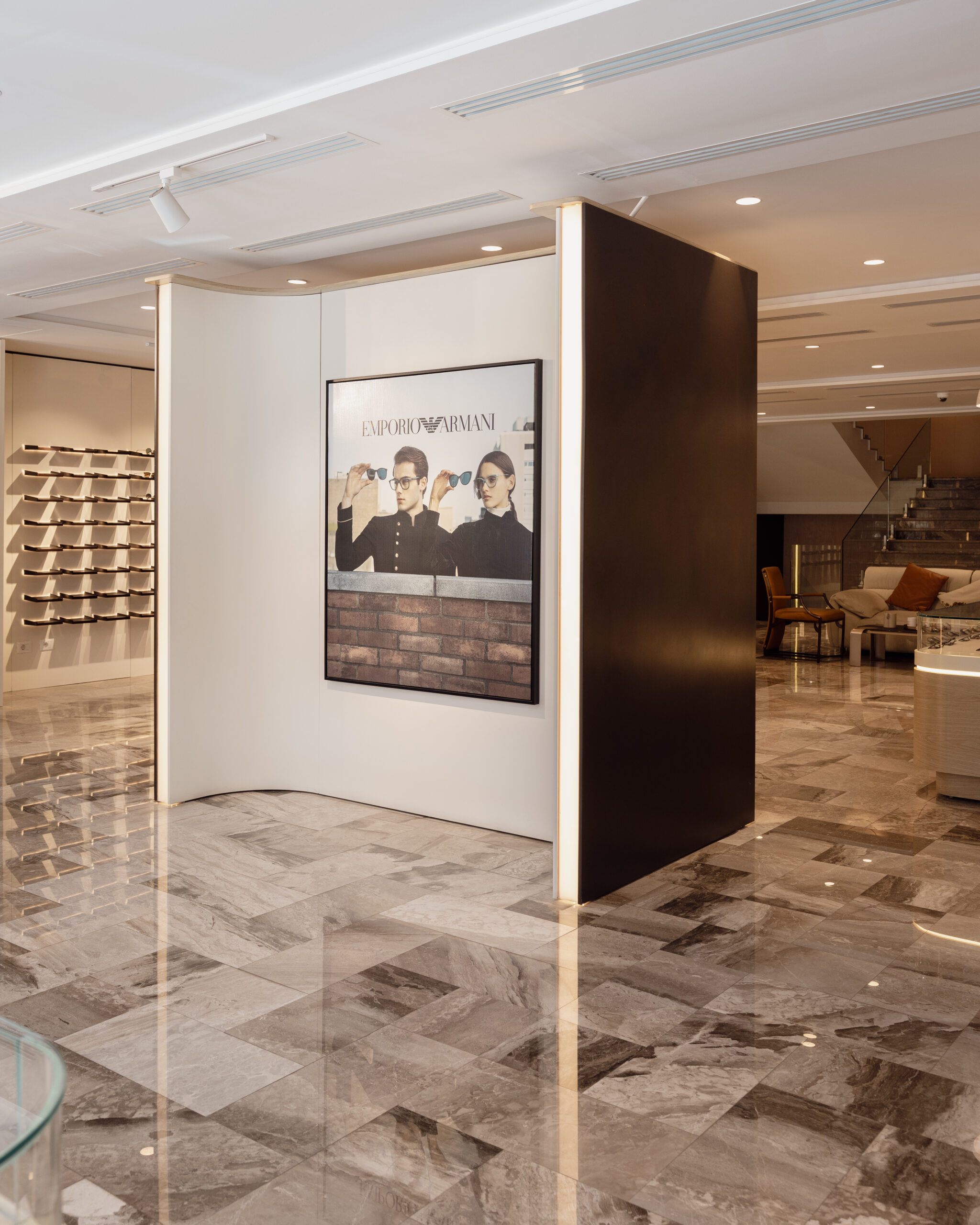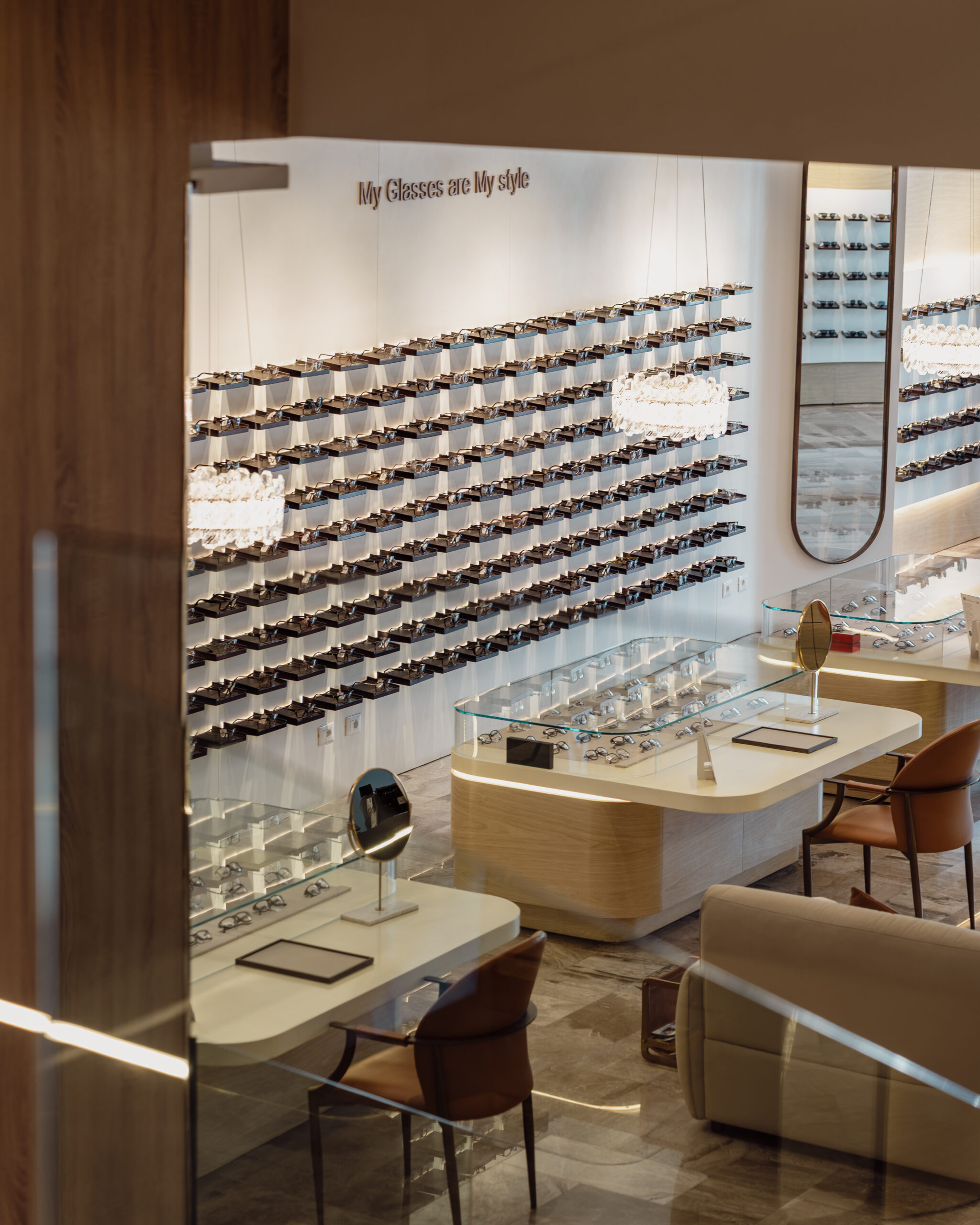 Our design incorporated natural, flowing lines and materials, such as wood in various shades, marble, and glass. We also featured distinctive metallic stands with leather bases, serving as focal display points for each pair of glasses. The layout of the showroom was carefully studied to provide ample space and comfort, ensuring a pleasant and distinguished customer experience that embodies the brand's identity and essence.