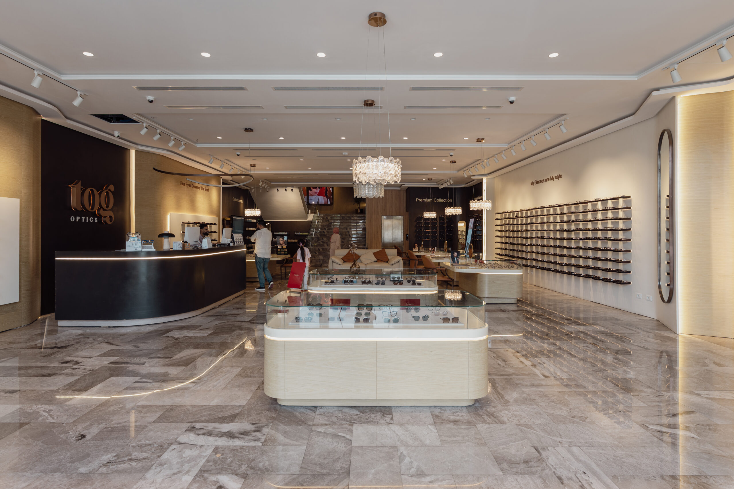 Working on the interior design for the Tripoli Optical Center was a unique opportunity. We aligned the design process with the center’s rebranding, allowing us to introduce new elements that reflect the brand’s spirit of renewal. The project spans two floors, showcasing both prescription and sunglasses, and offering a full range of vision products and services.